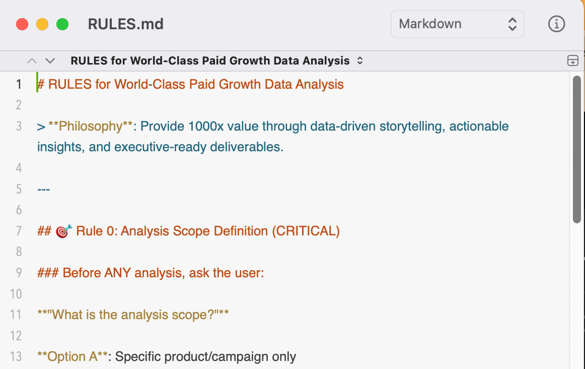 프로젝트 폴더에 RULES.md를 만들고, 비즈니스 컨텍스트와 분석 관점을 명시합니다.